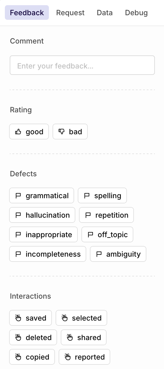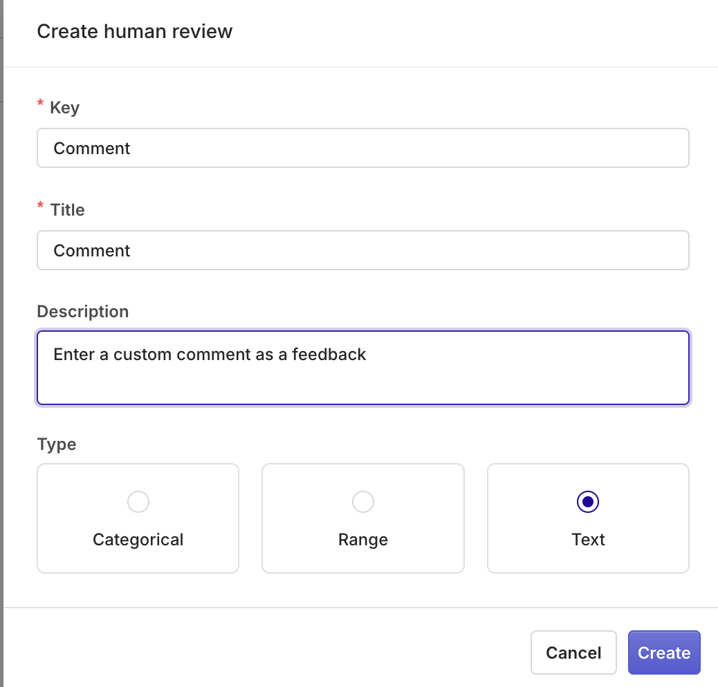 Human Review lets you create custom fields to issue Feedback on generations. Feedbacks can be various and Human Review lets you tailor the exact type of information you need to qualify model generations.A workspace comes with built-in default Human-reviews, to learn more, see Feedback Types.