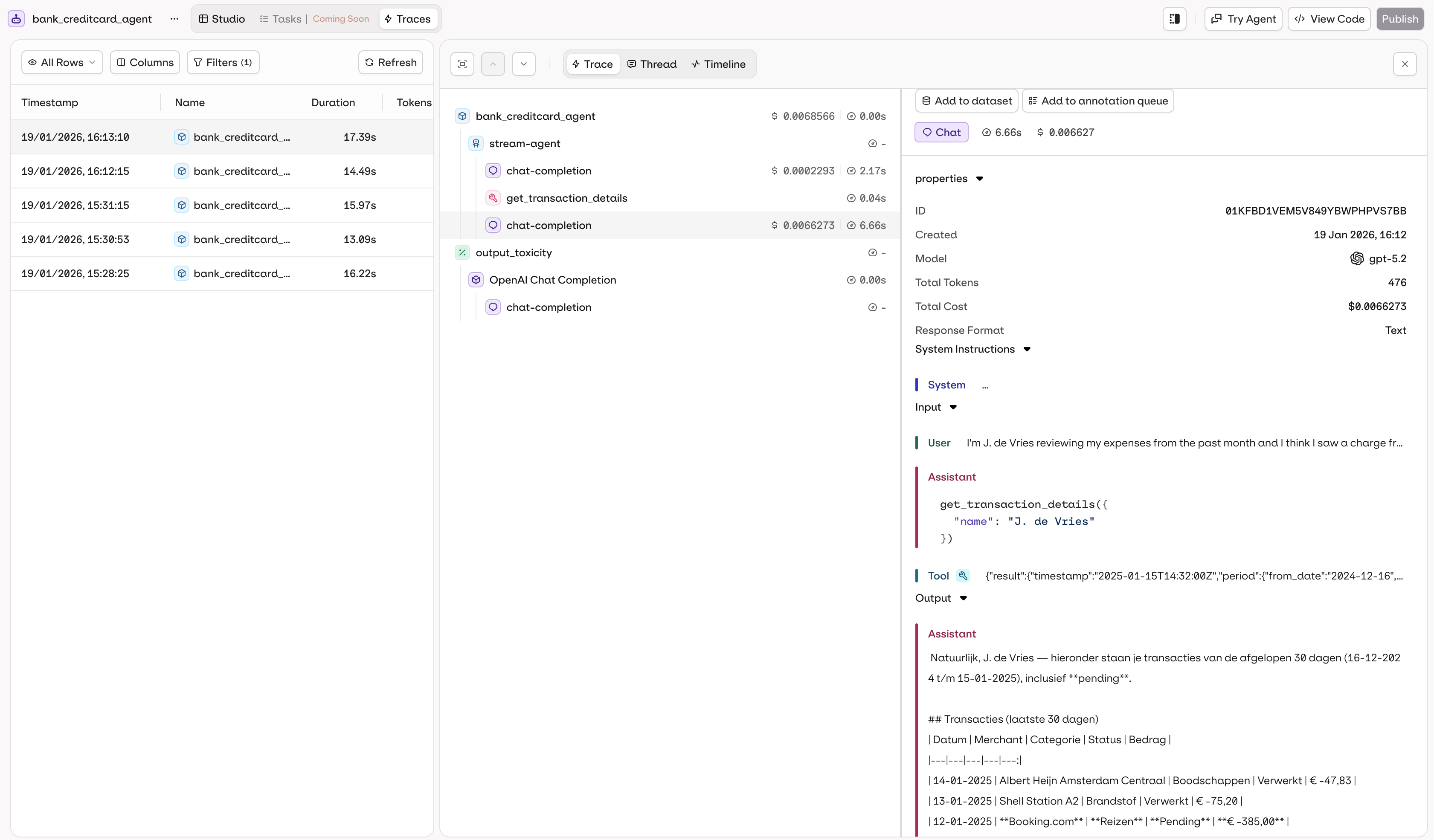 The Traces tab in the agent page provides direct access to execution logs for your agent. All traces are automatically filtered to show only calls made with this agent.
