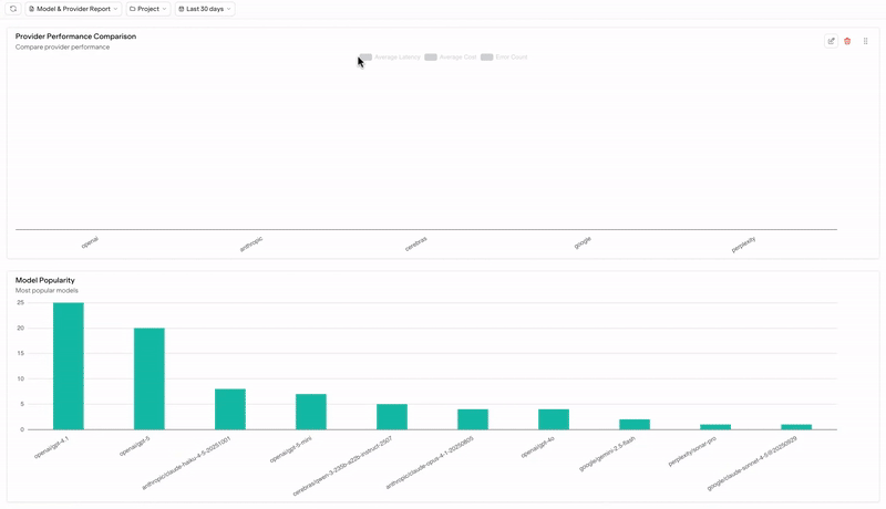 You can build your own custom report by selecting and combining charts from different clusters. Use the time range and project filters to focus on the data that matters most to you. For example:- Compare total cost and latency trends over the past 30 days