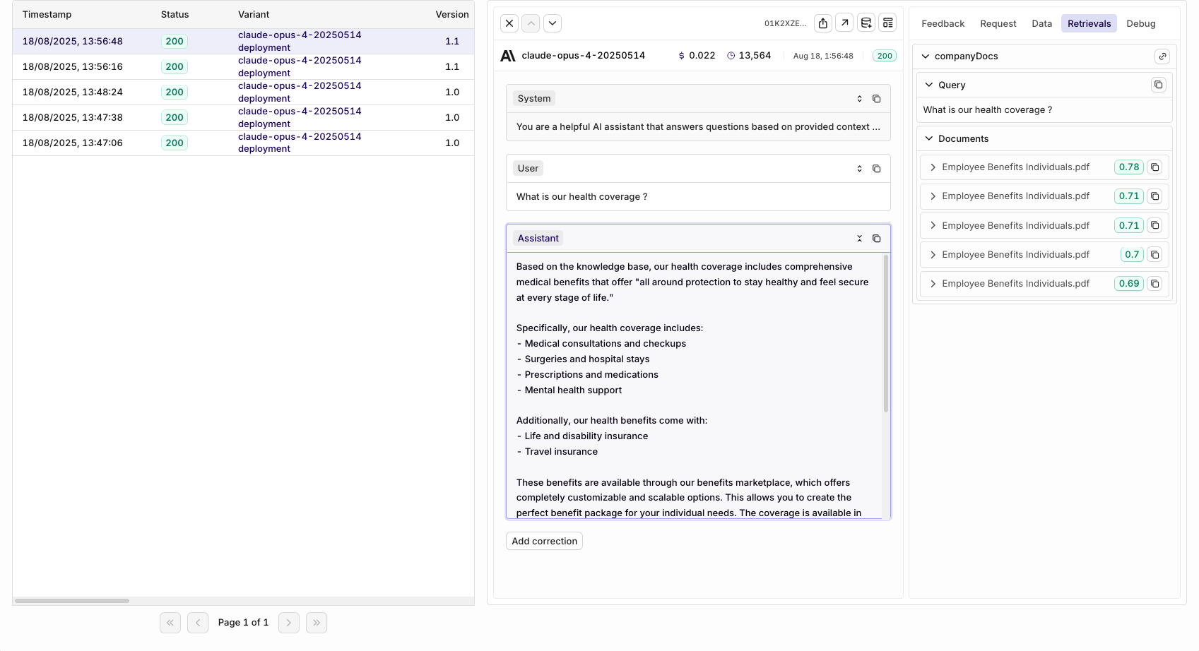 Going back to the Deployment page, you can view the calls made through your RAG application. You can view details for a single log by clicking on a log line. This opens a panel containing all the details for the log, including:- The user’s question and generated response