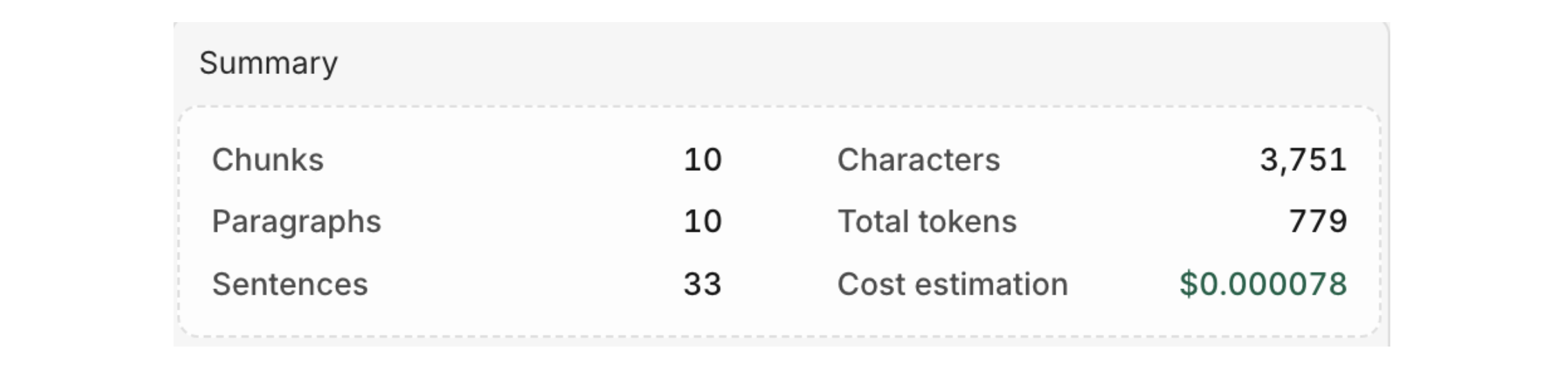 Here you can see details of the data parsed into your Knowledge Base and estimate the cost of retrieval.