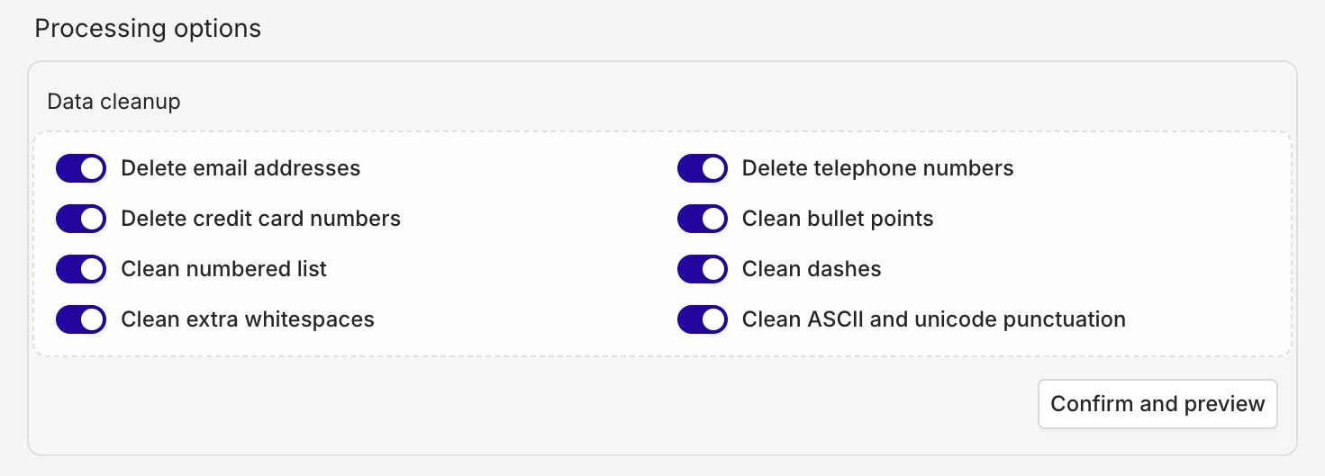 You can choose to modify the data loaded within your sources, this can be great to clean the chunks or anonymize data. To activate each cleanup, simply toggle on the option within the data cleanup panel.