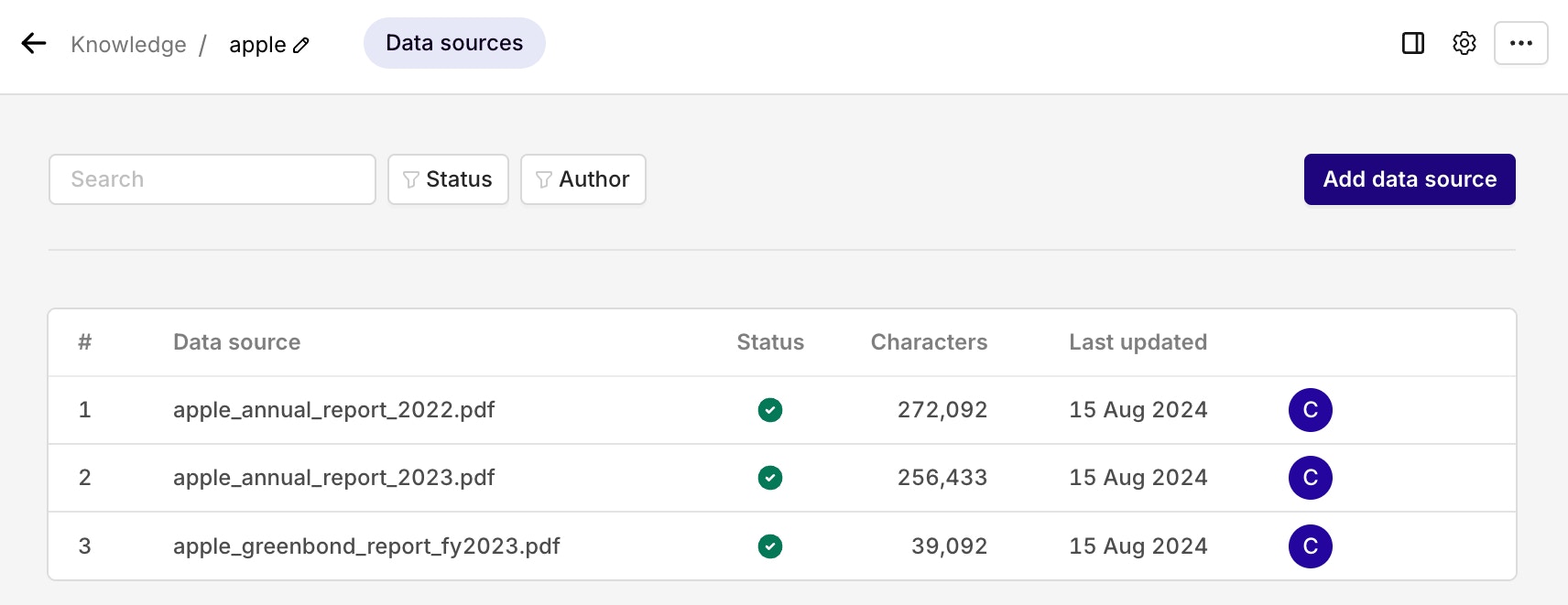 You are then taken to the source management page. A source represents a document that is loaded within your Knowledge Base. This document’s information will then be used when referencing and querying the Knowledge Base. Documents needs to be loaded ahead of time so that they can be parsed and cut into chunks. Language models will then use the loaded information as source for answering user queries. To load a new source, select the Add Source button. Here you can add any document of the following format: TXT, PDF, DOCX, CSV, XML.
