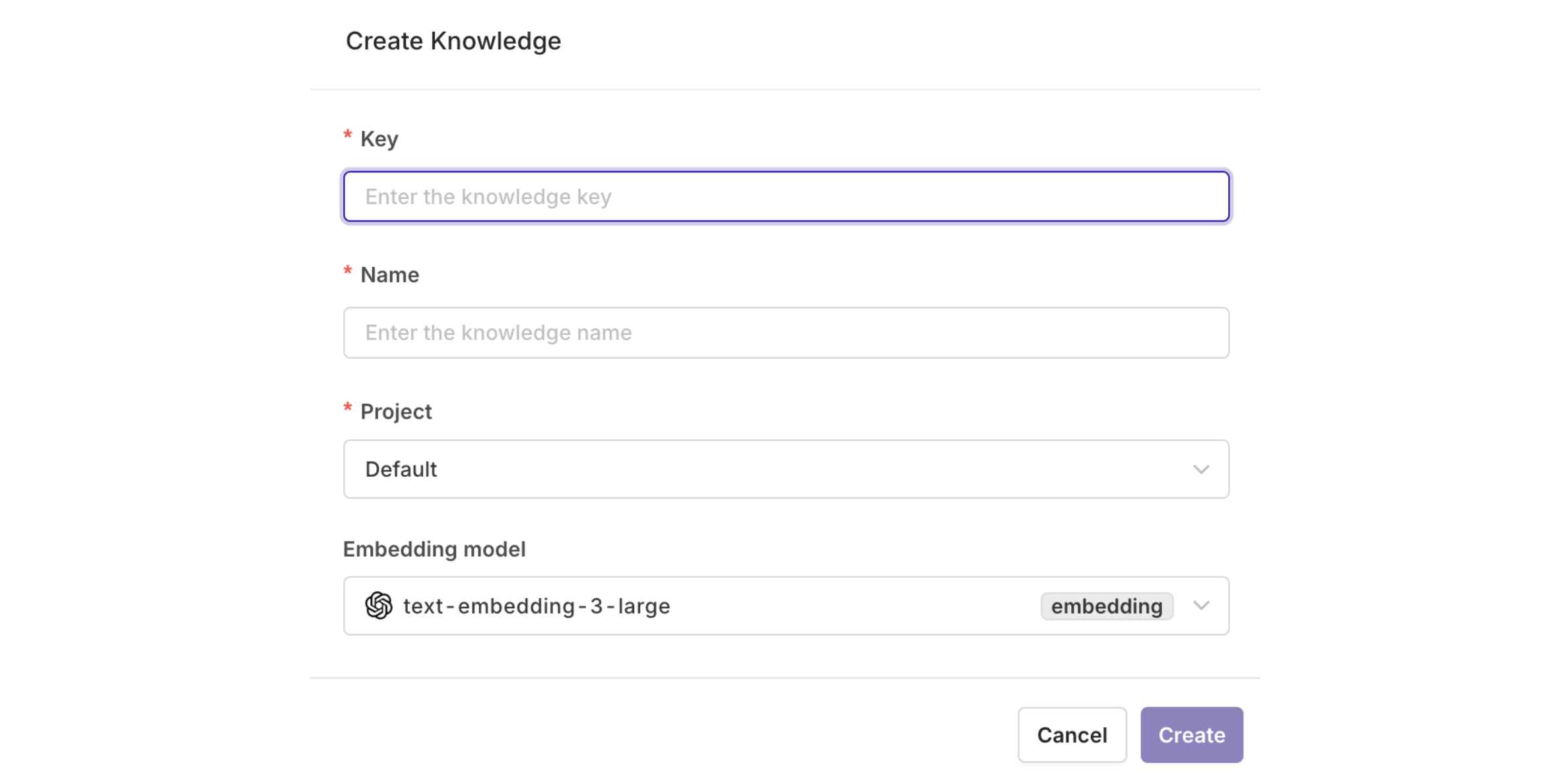 Here you can enter a unique Key that will be used to reference your Knowledge Base within Prompts and Deployments. Also enter a Name and which Project this knowledge belongs in. You can also choose an available Embedding Model to use during knowledge search.