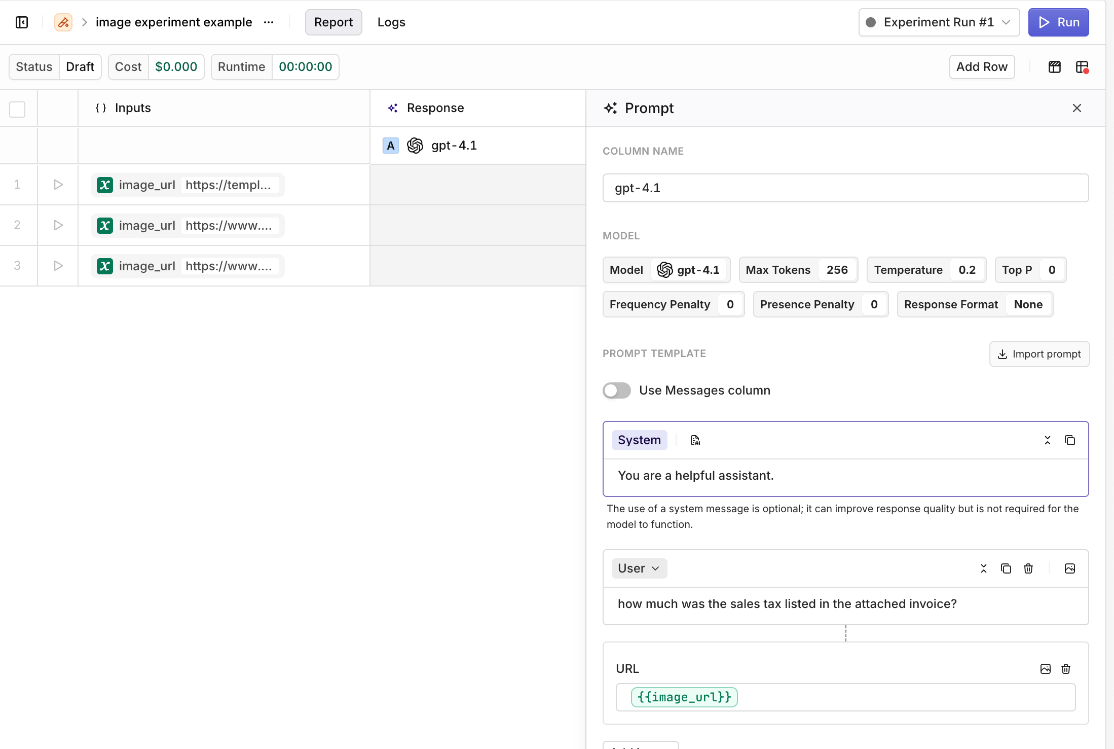 You can also use images in combination with vision models to run an Experiment. Make sure to use the image message block and urls in your dataset. In the example screenshot below, you can see that theimage_block is pointing to {{image_url}} inputs, which will iterate through the URLs in the dataset.