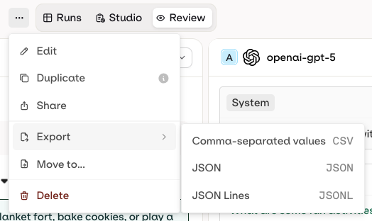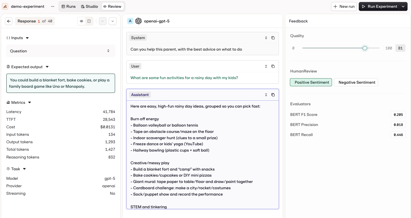 The Review mode displays responses individually, allowing you to inspect each model output in detail, and see the following:- Inputs & Outputs: Full conversation context with system prompts, user messages, and model responses