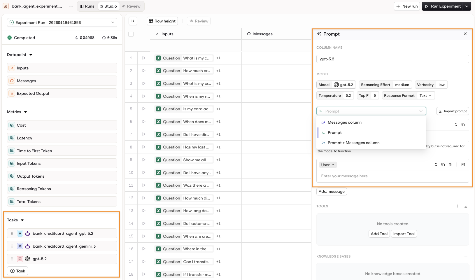 Before creating an Experiment, you need a Dataset. This dataset contains the Inputs, Messages, and Expected Outputs used for running an Experiment.- Inputs – Variables that can be used in the prompt message, e.g.