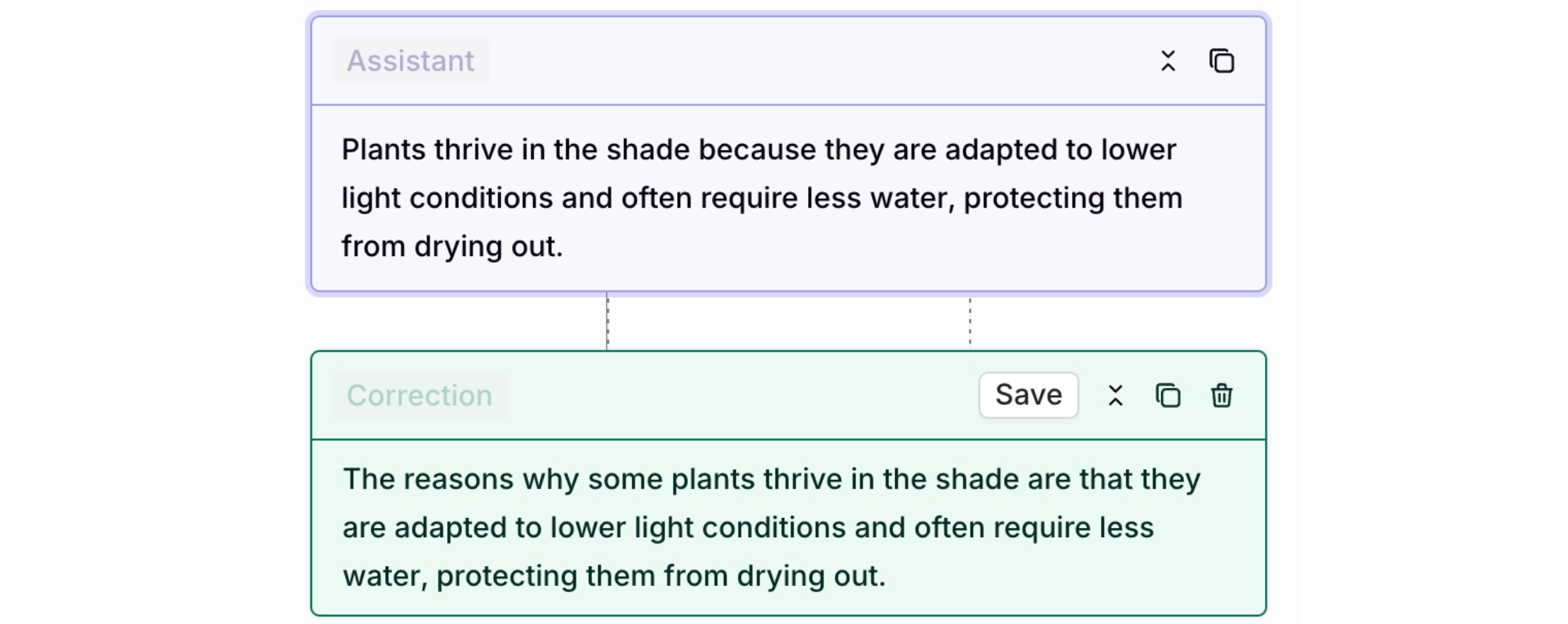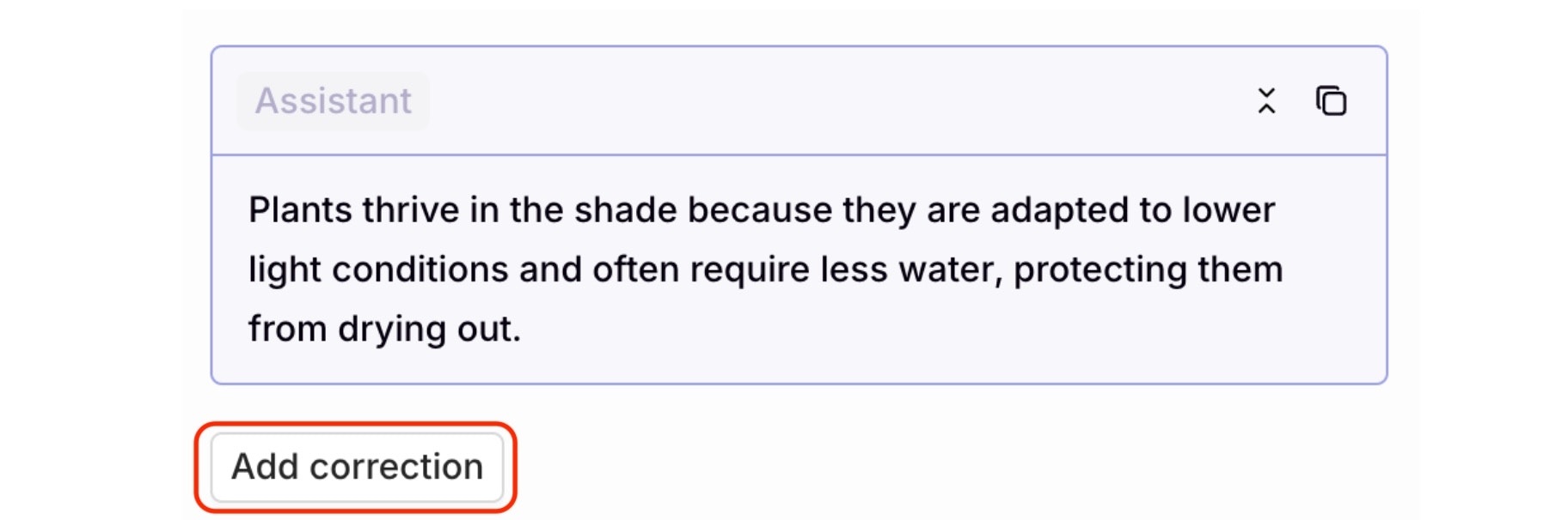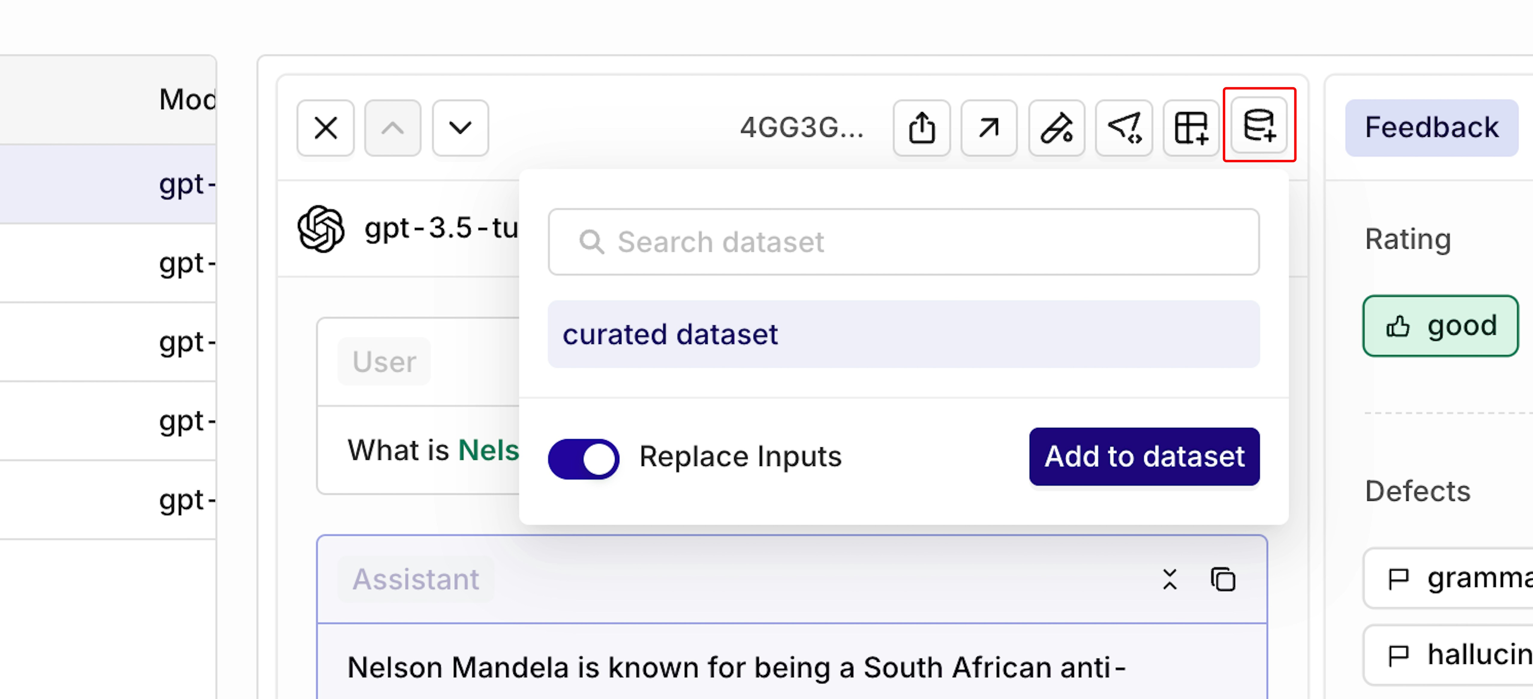 Once chosen and eventually corrected, you can choose to add the response to a Curated Dataset. To do so select the Add to Dataset icon at the top-right of the response: Here you will see a list of datasets you can add the log to, to create a new Dataset, see Creating a Dataset.