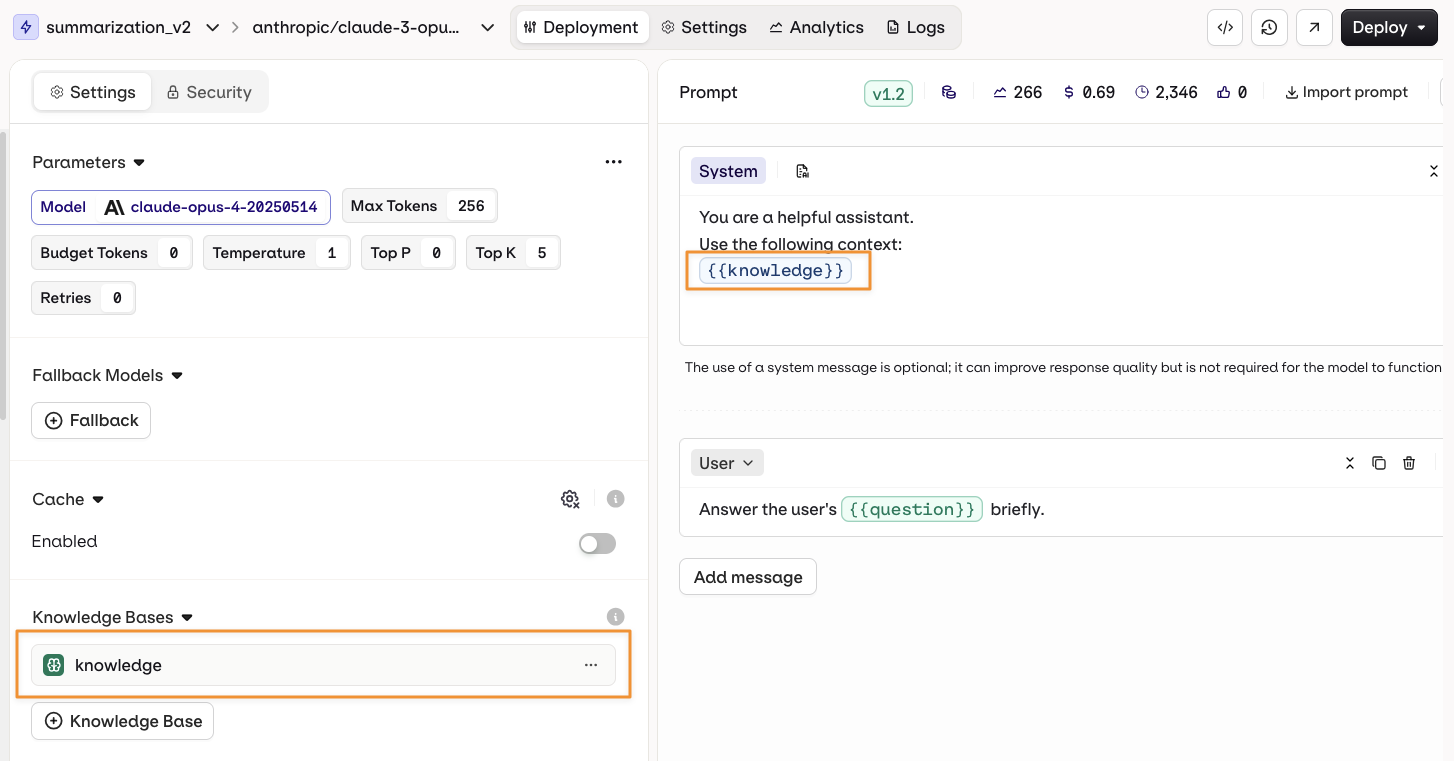 {{knowledge_base_key}} syntax where knowledge_base_key is the identifier of your Knowledge Base. If the Knowledge Base is not explicitly referenced in the prompt, the retrieved chunks are automatically appended to the end of the system message.