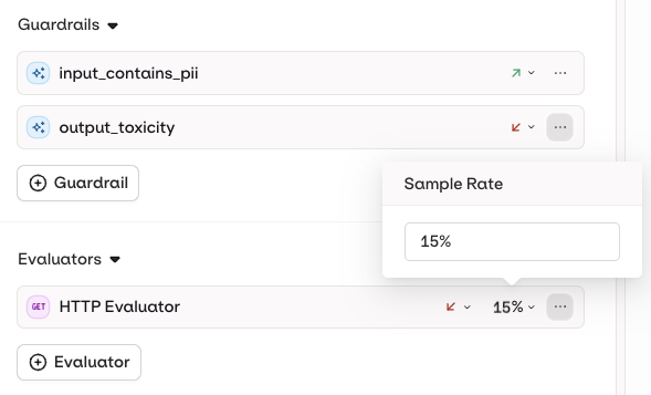 Click Guardrail to add a guardrail-capable evaluator from your Library. A Guardrail runs synchronously and will deny the generation if its evaluation fails, returning an error to the user. Guardrails can also be configured: