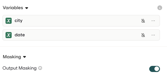 In a Variant you can add configuration to make generated outputs hidden from logs and traces. Head to the Security tab and enable the Output masking toggle: Effect on logs and traces When Output Masking is enabled, logs and traces won’t store the generated response. The following is displayed in place of the response: