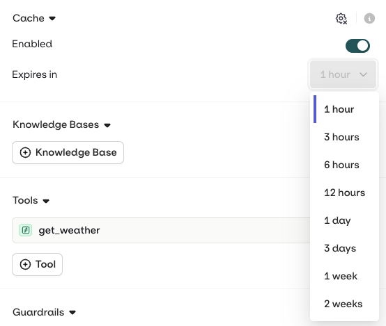 TTL (time to live) corresponds to the amount of time a cached response will be stored and used before being invalidated. Once invalidated, a new LLM generation will be triggered. You can configure the time-to-live once Caching is enabled by choosing from the drop-down.