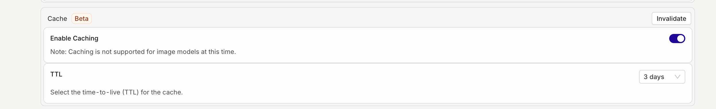 Deployment generation can be cached to reduce processing time and cost. When an input is received and cached already within the Deployment, the stored response will be sent back directly without triggering a new generation. To enable caching head to a Deployment > Settings. Select Enable Caching.