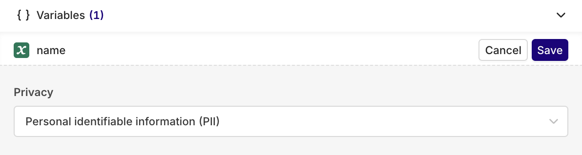 In your deployment, when using input, you can decide to flag the created input as a PII (Personally Identifiable Information). This is recommended when processing sensitive data from your users (e.g. name, email, phone number). To do so, when configuring your input, choose the PII (Personally Identifiable Information) from the Privacy drop-down.