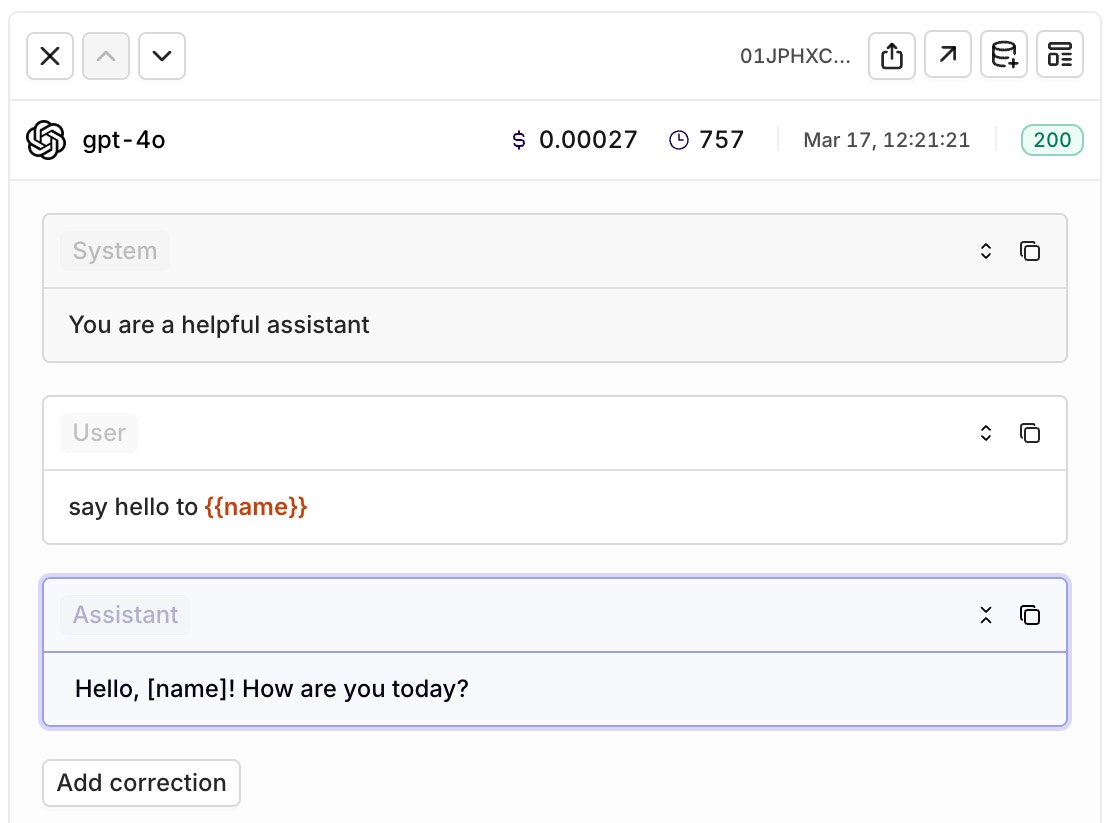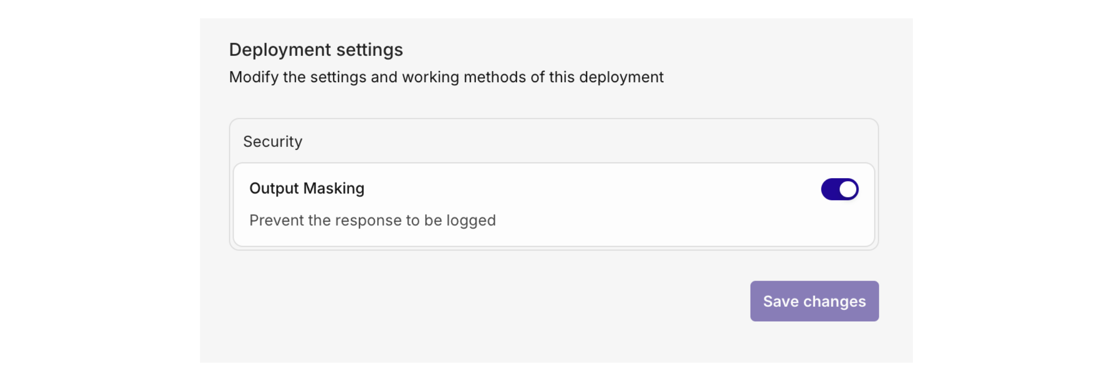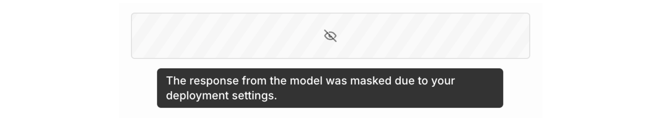 When Output Masking is enabled, logs won’t store the generated response. The following is displayed in place of the response: