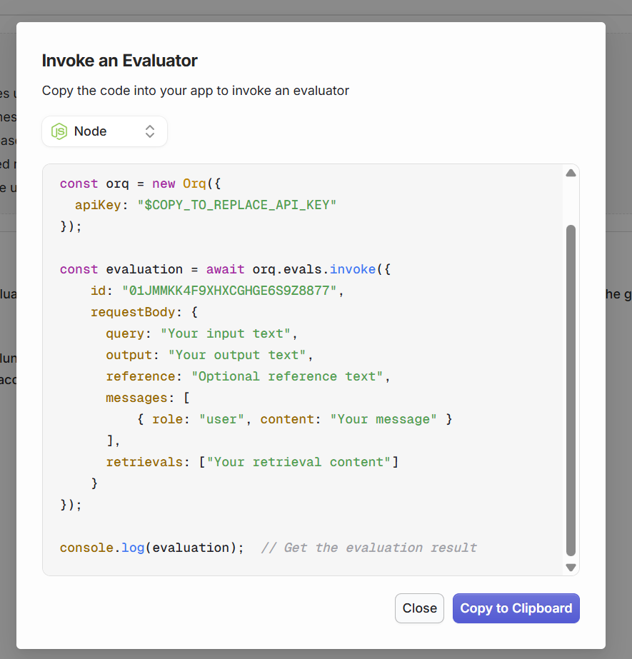 It is also possible to call a custom-made Evaluator made on orq using the Invoke a Custom Evaluator API call. You can fetch the Evaluator ID to send to this call by searching for Evaluators using the Get all Evaluators API. Finally, through the Orq studio, find the View Code button on your Evaluator page. the following modal opens: