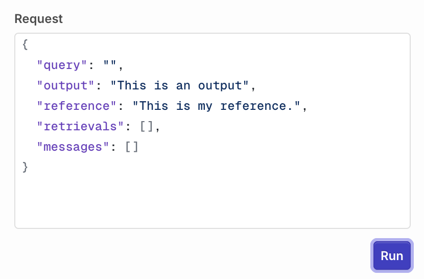 Within the Studio, a Playground is available to test an evaluator against any output. This helps validates quickly that an evaluator is behaving correctly To do so, first configure the request: