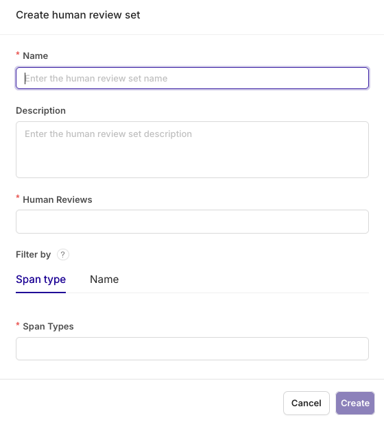 Human Review Sets are ways to group multiple human review fields together and assign them to specific traces based on Span Type or Name filters.