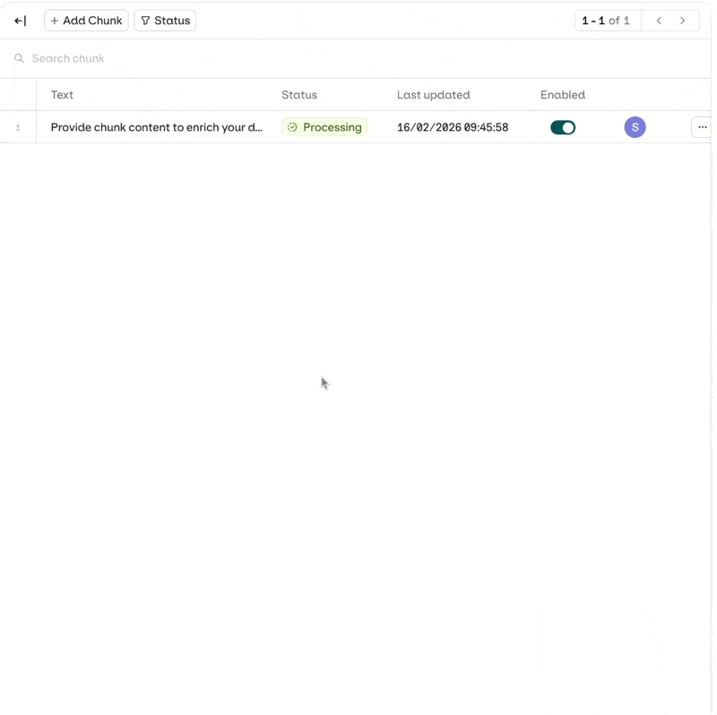 Open a chunk from the datasource view to access the Edit Chunk panel. The panel has three sections:- Text: the chunk content.