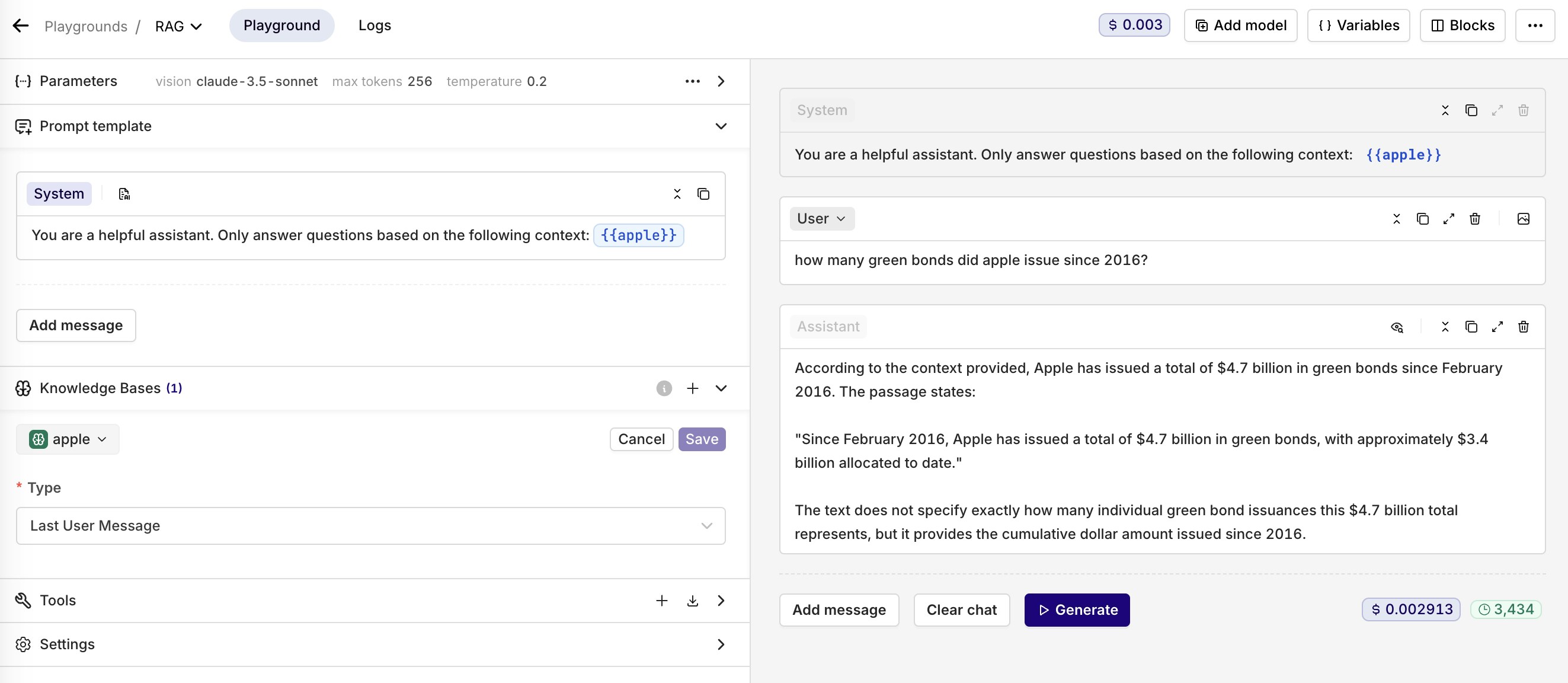 To use a Knowledge Base within prompts, use the{{key}} syntax where key is the key of your Knowledge Base.