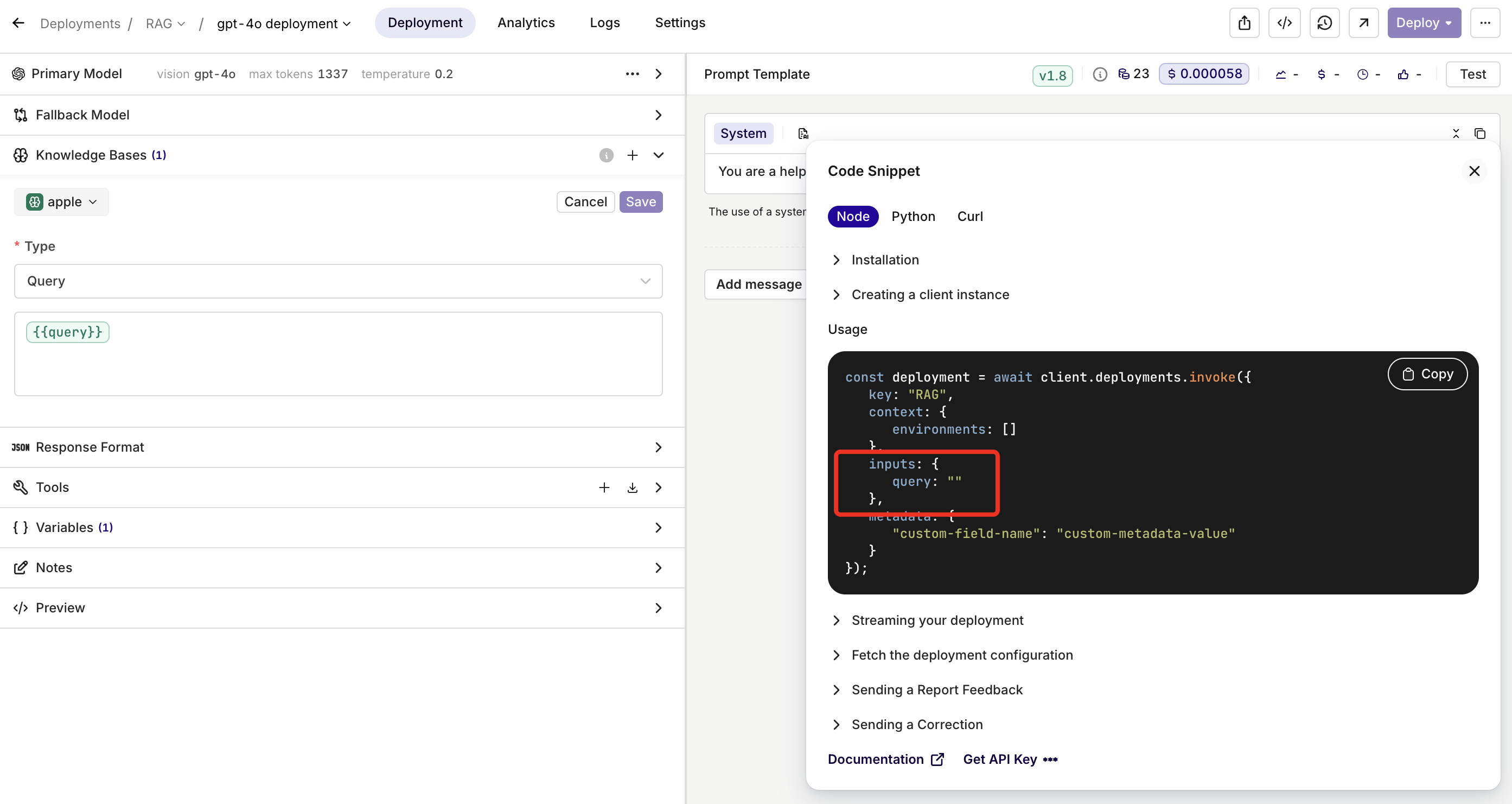 {{query}}``invokeHere we are using the input variable {{query}} and it is reachable through the invoke call as an input, letting you dynamically define the Knowledge Base query at runtime.