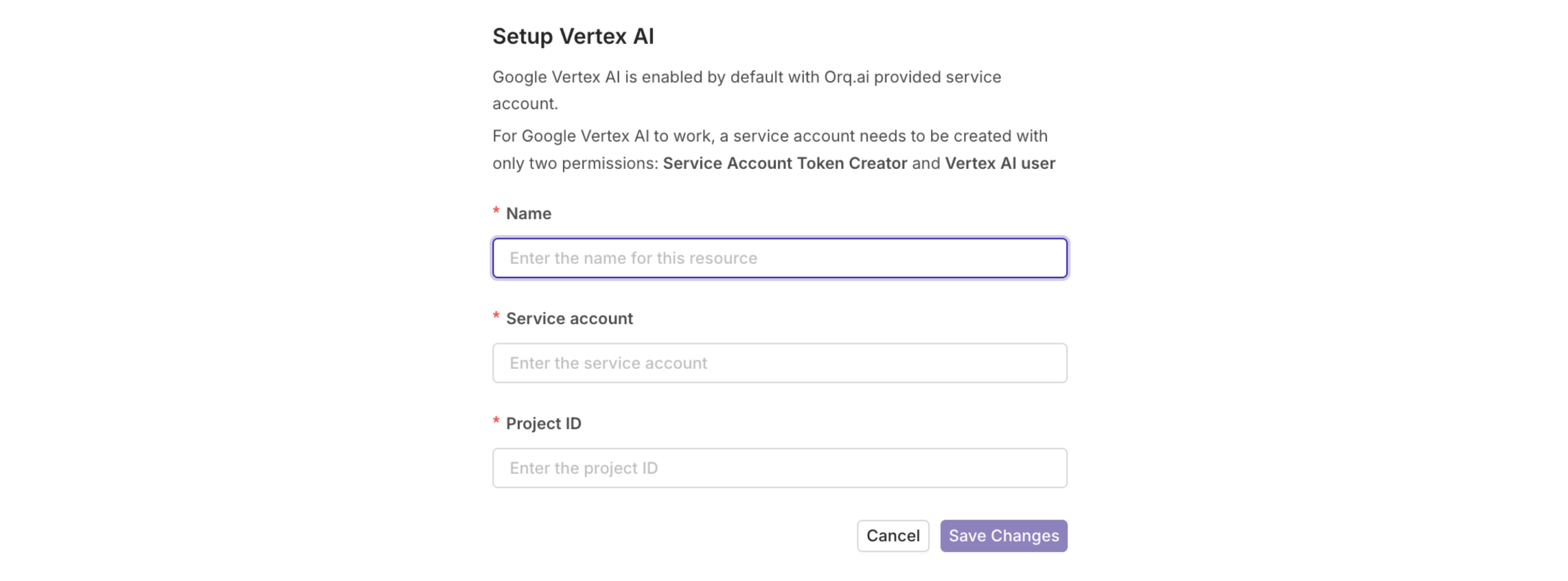 To start integration, you first need to create a Service Account with only two permissions: Service Account Token Creator and Vertex AI user. Head to the Providers tab in the Model Garden and select Google Vertex AI > Set up your own API Key.