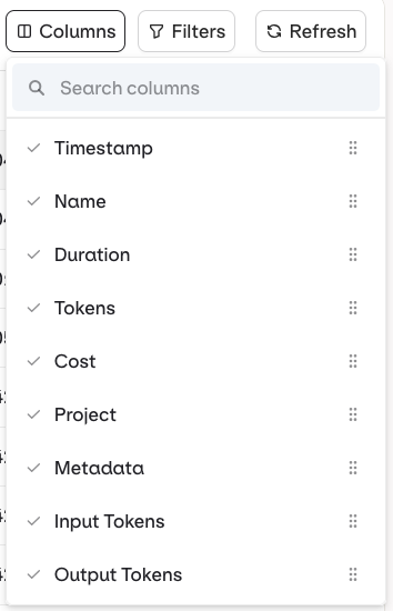 Columns can be enabled and toggled to display more available data in the traces list.