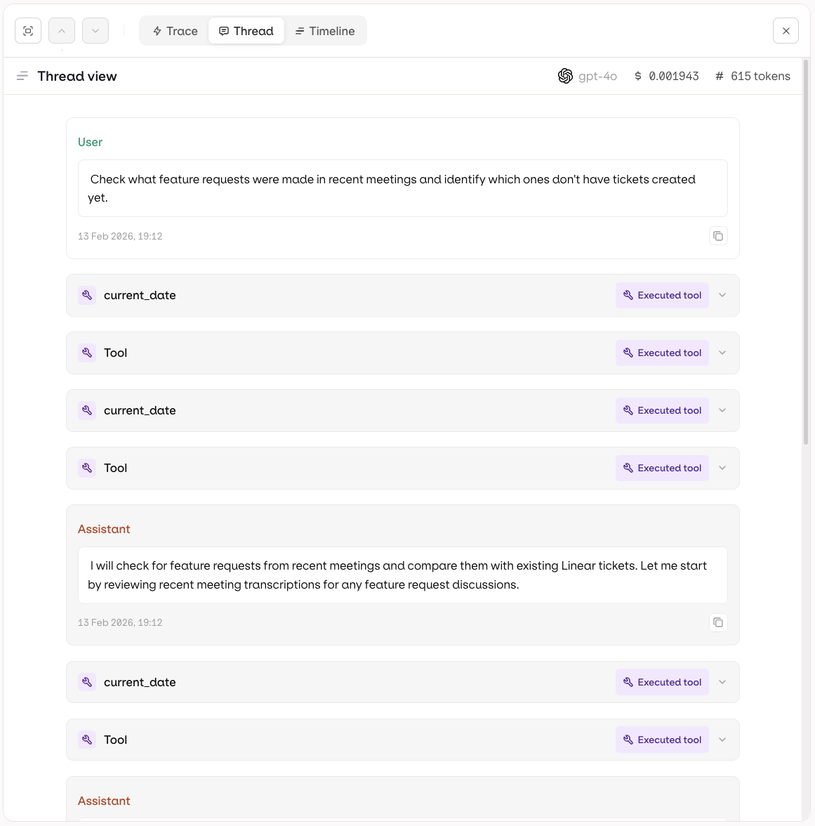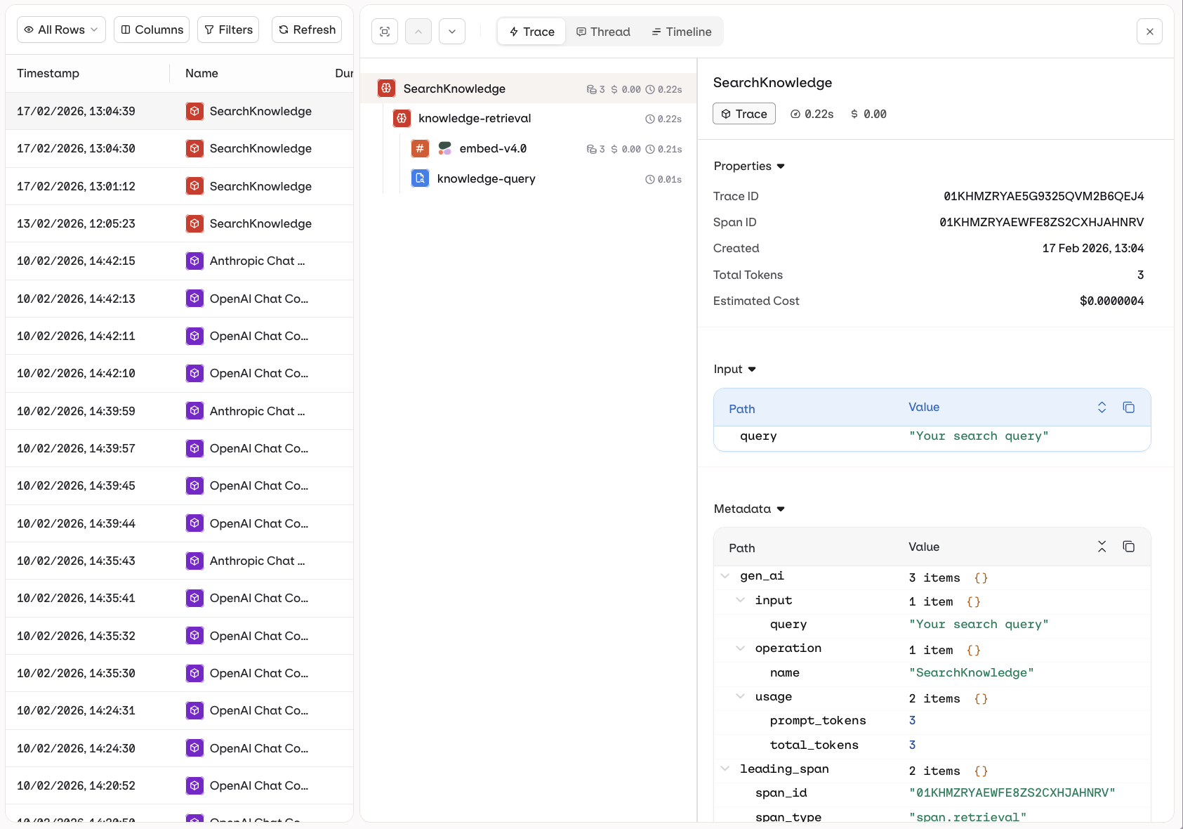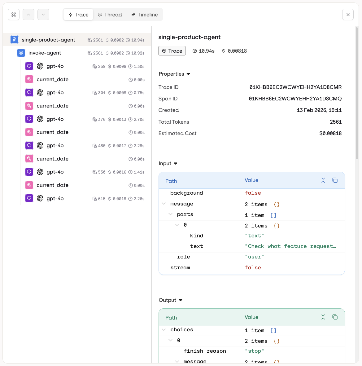The Trace view shows the full execution tree for a single run. Each step is displayed hierarchically, including LLM calls, tool invocations, knowledge retrievals, and memory interactions. Use this view to inspect inputs, outputs, token usage, and latency at every step.
