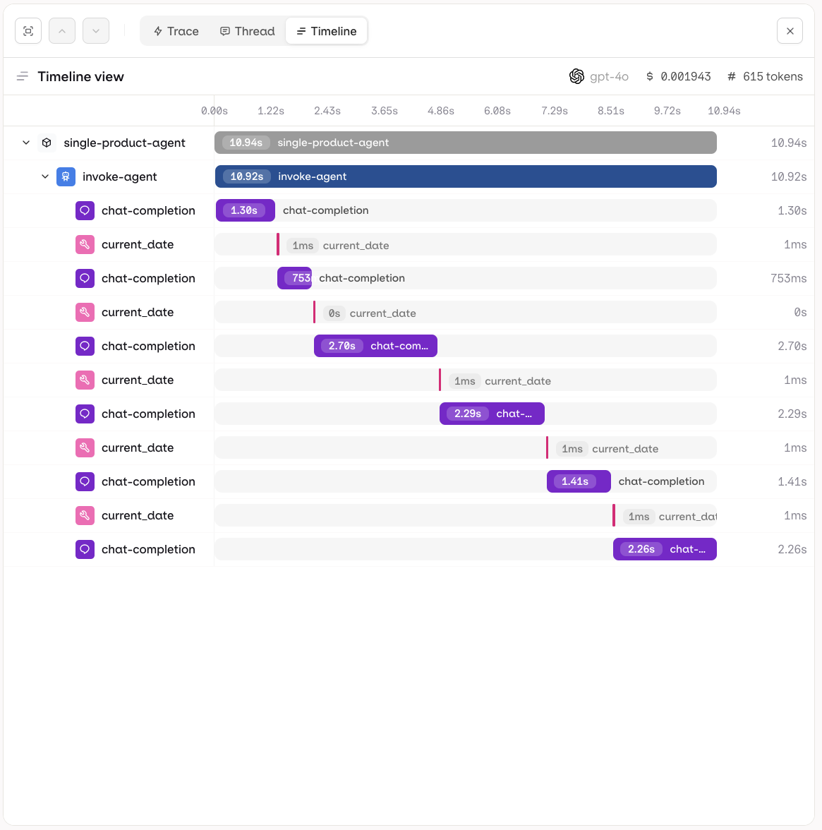 Each trace can be inspected in three views to suit different debugging and analysis needs.- Trace