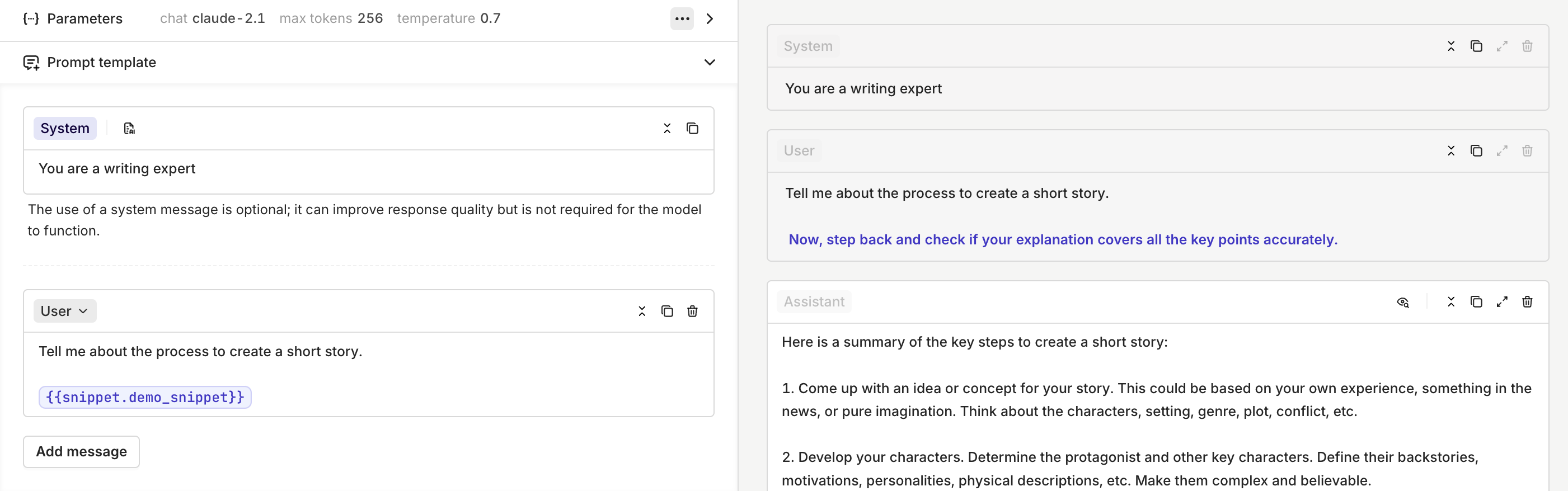 To reference a Prompt Snippet, use within your prompt, you will see snippets correctly loaded if they are shown in blue within your prompt. At generation time, snippets will be replaced by the previously entered configuration.