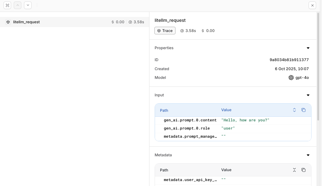 Head to the Traces tab to view LiteLLM traces in the Orq.ai Studio.