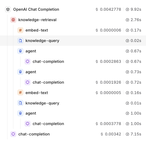 Within the Traces, you can see the knowledge retrieval step Orq.ai automatically injects into your call to enrich the model context with the linked Knowledge Base.