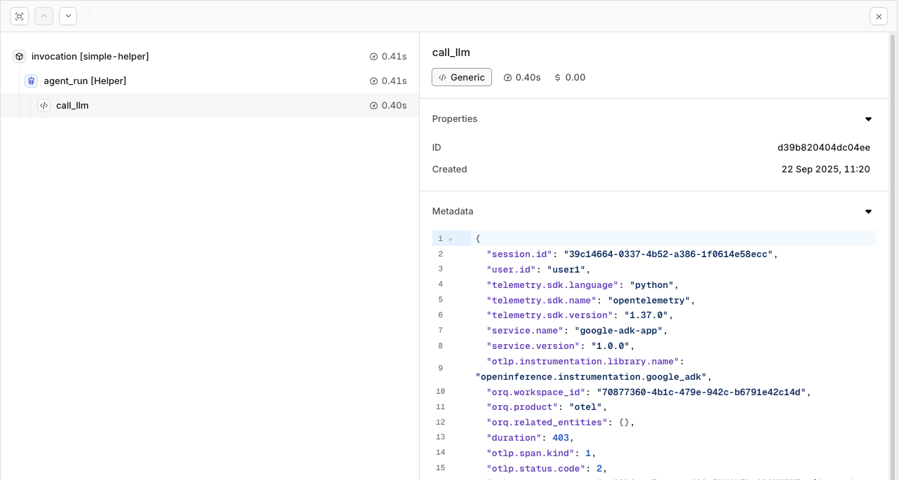 Best for: Comprehensive ADK instrumentation with automatic tool and model trackingTo view more examples of ADK implementation, browse the Google ADK Samples repository