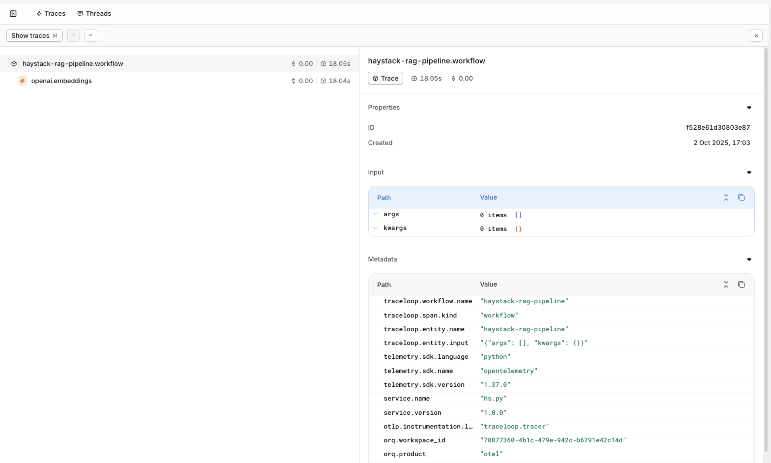 Deepset Haystack is a powerful framework for building RAG (Retrieval-Augmented Generation) pipelines and document search systems. Tracing Haystack with Orq.ai provides comprehensive insights into pipeline performance, component interactions, retrieval effectiveness, and answer generation quality to optimize your search and QA applications.Prerequisites