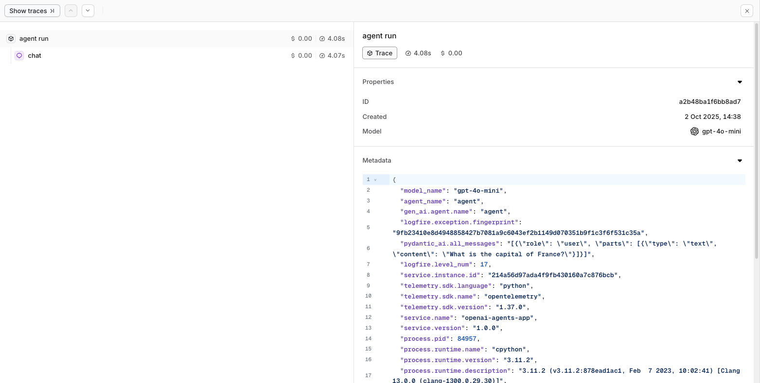 Choose your preferred OpenTelemetry framework for collecting traces, we’ll be using LogFire.Examples