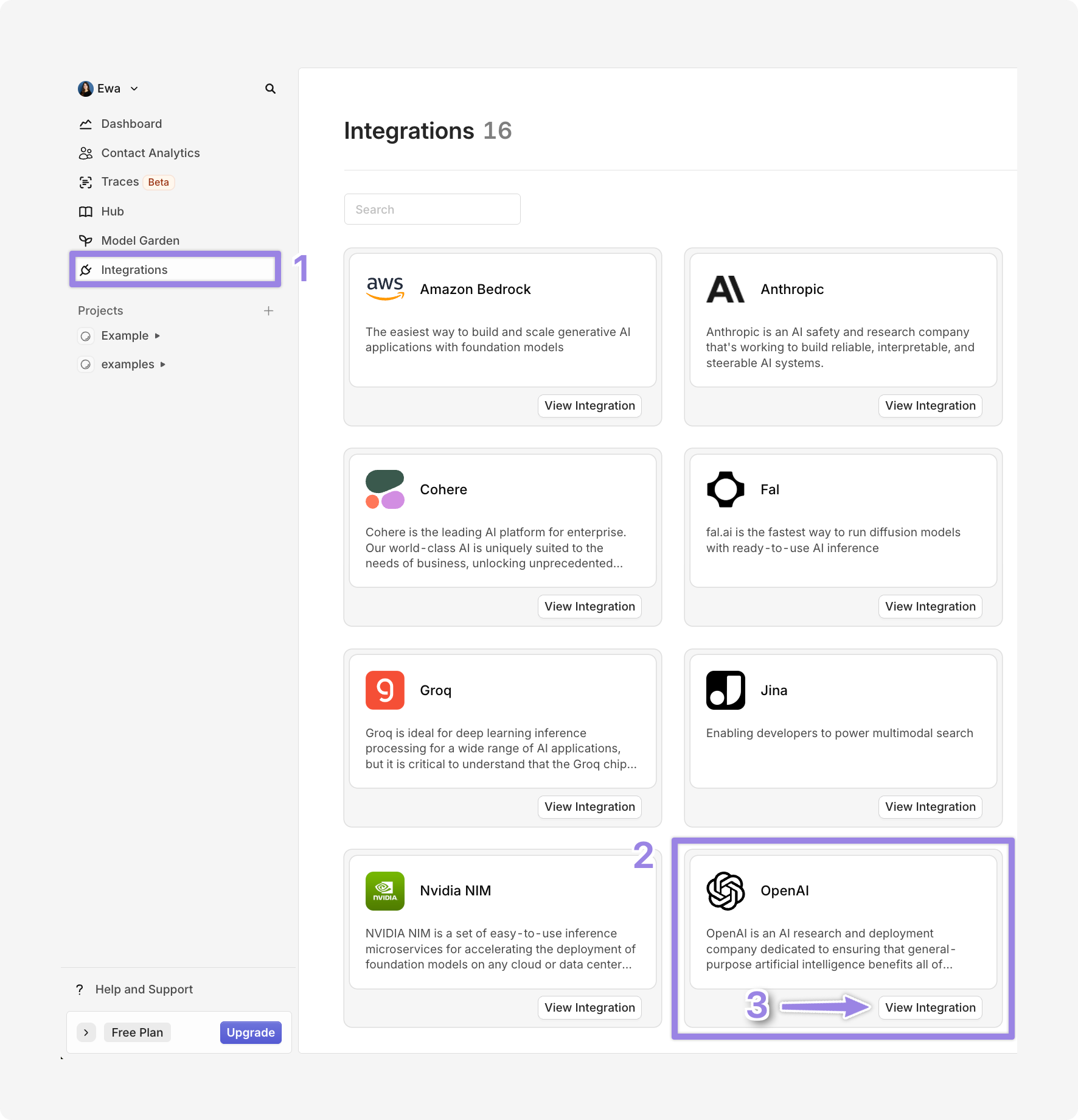 To get started you need to decide which provider you want to connect to. This is a sample OpenAI integration:- Navigate to Integrations