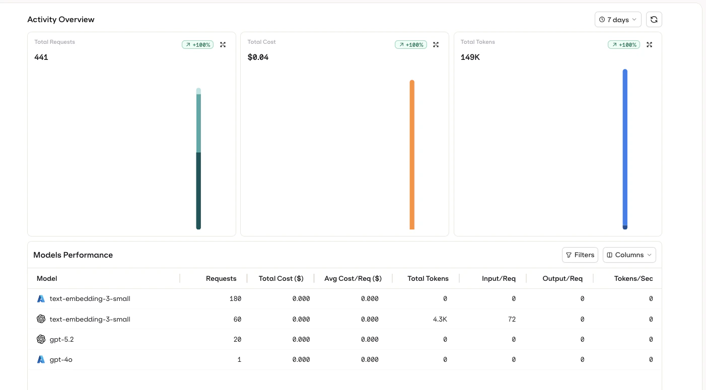 In the AI Router Activity page, view the Real-time Activity and Metrics for your Router:- Visualize Requests, Costs and Token Usage