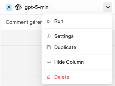 It is often useful to add an extra prompt after running an experiment, to tweak a configuration or try a different version. Once a new Prompt is added, select and choose Run to run on the existing Dataset.
