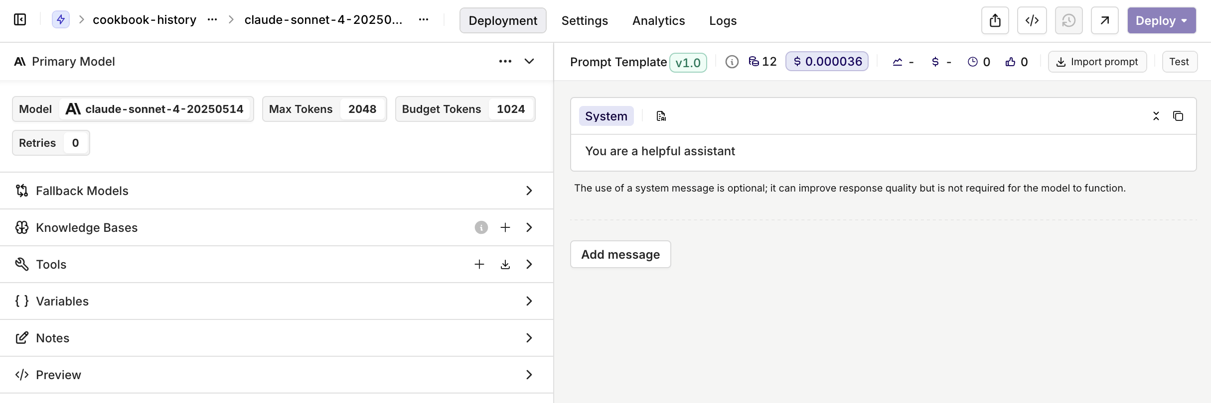 Prepare a Deployment using any chat model, here we’re using claude sonnet 4, the default configuration is sufficient for this cookbook.