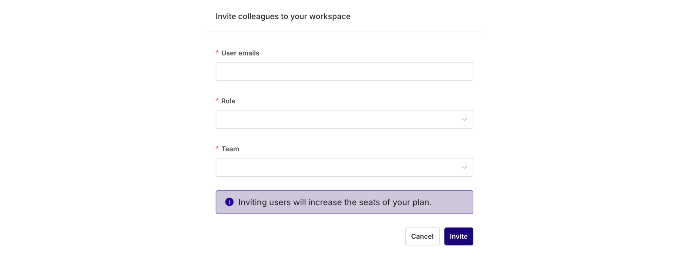To create a member, click on your workspace name and choose Invite and manage members. Then select Invite Colleagues, the following modal opens: